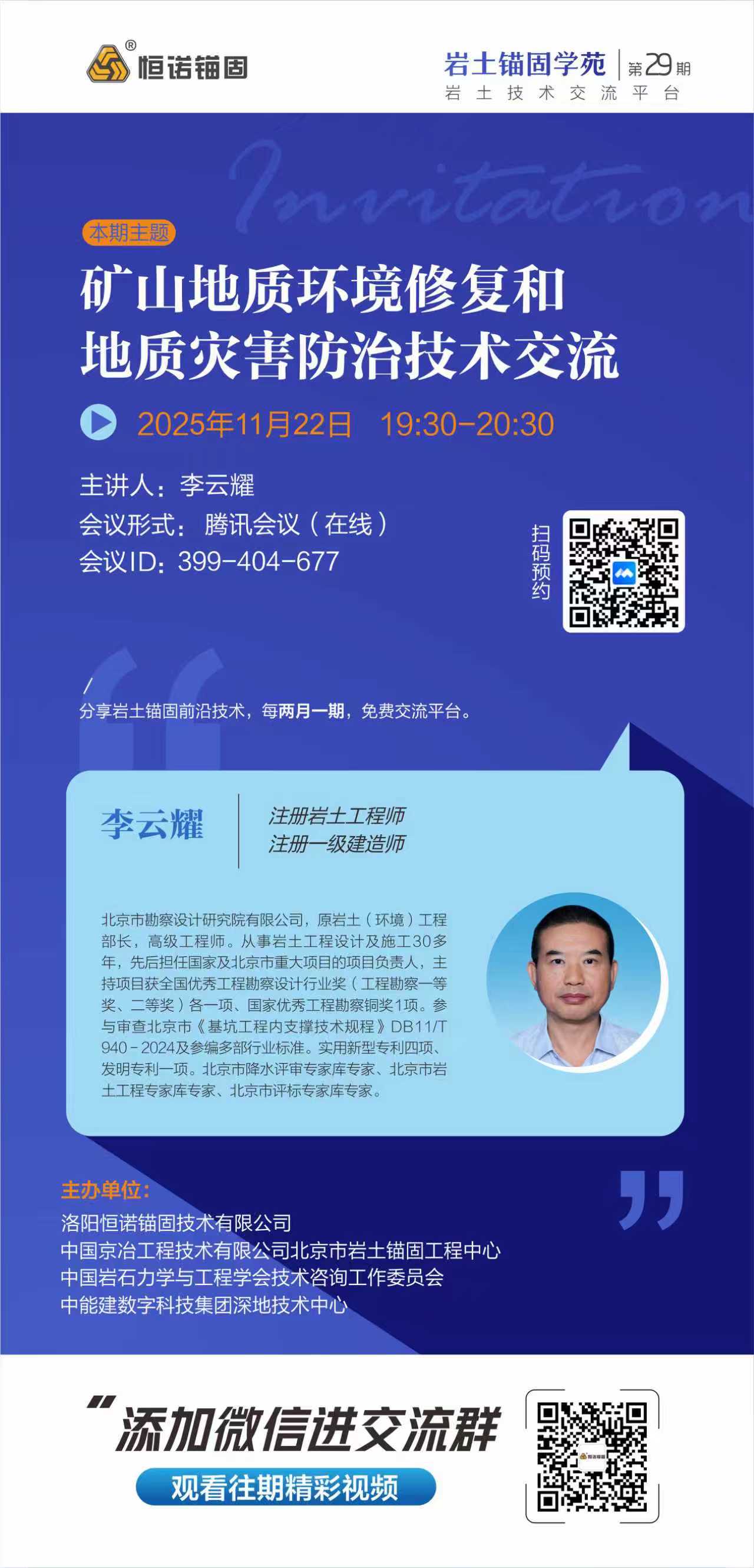 巖土錨固學苑將于2025年11月22日(周六)19:30-20:30舉辦第29期,本期主題:礦山地質環境修復和地質災害防治技術交流,歡迎廣大巖土錨固領域愛好者參與交流。